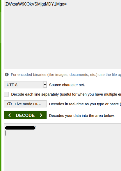 also, the /license page gives us some password with base 64 encoded